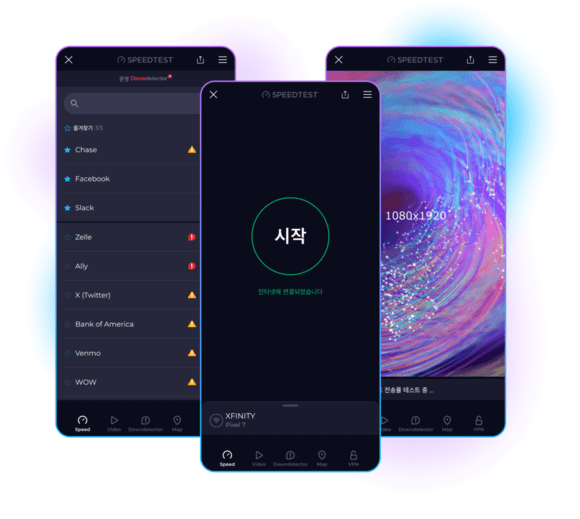 Ookla®의 Speedtest의 미션은 실제 인터넷 속도에 대한 데이터와 통찰력을 제공함으로써 인터넷 속도를 개선하는 것입니다. 전 세계적으로 이루어지는 수십억 회 테스트를 통해 여러분이 가장 많이 사용하는 장치용 앱으로 어디서든 서비스를 제공해 드릴 수 있습니다.